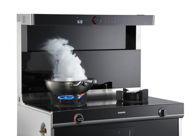 第二,集成灶近吸油煙不過臉。傳統油煙機吸油煙會過臉,而集成灶的吸煙口距離鍋口很近,油煙不過臉就被吸走。高端集成灶還有鯨魚仿生吸煙口,吸油煙快,不會跑煙,保護住了我們的皮膚和呼吸道健康,對開放式廚房來說是不錯的選擇。而且煙機與灶臺、是聯動的,做飯時很方便。