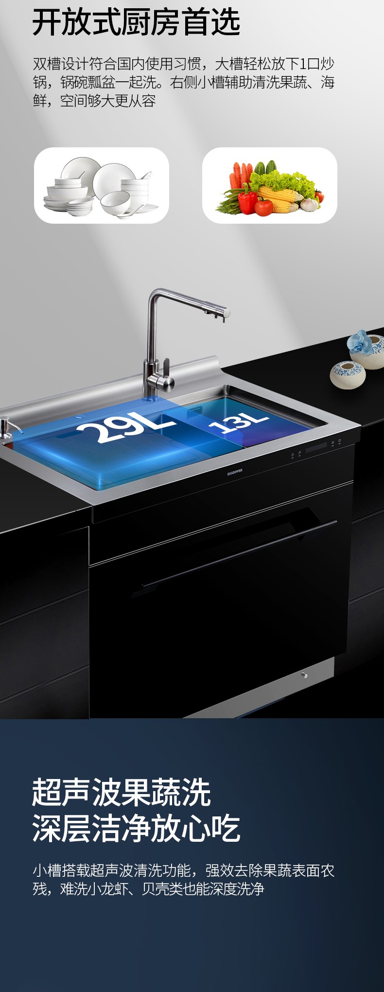 29L+13L寬大雙槽,餐后清潔不再捉襟見肘